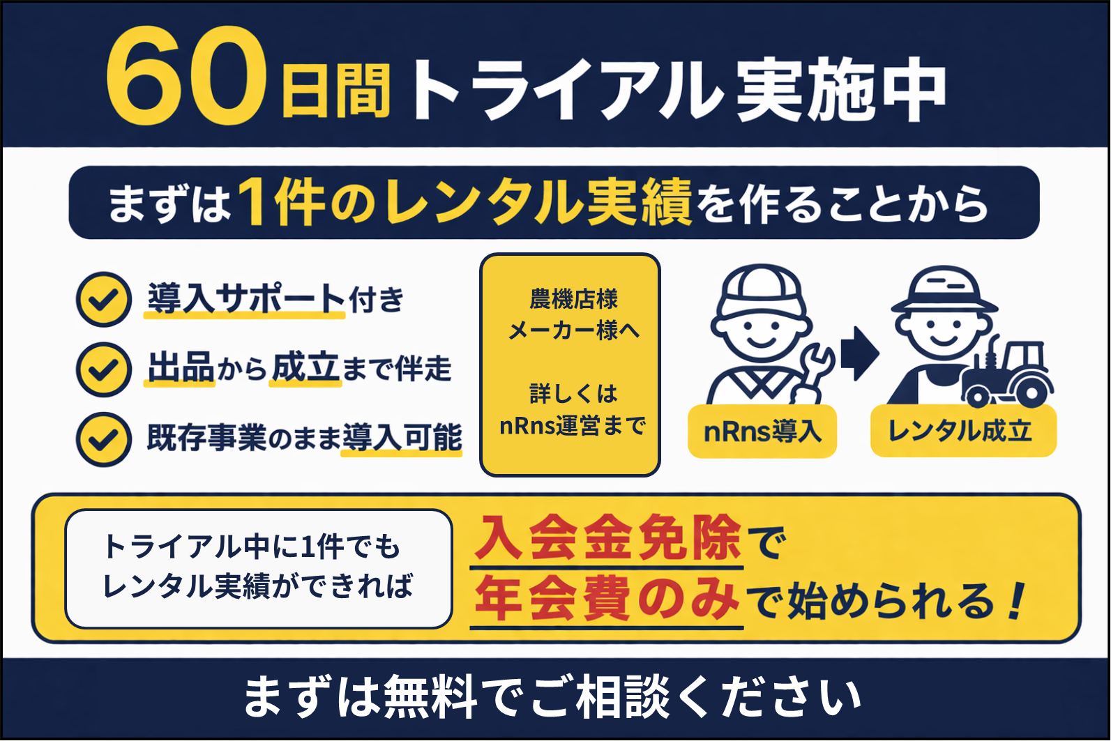 nRnsは、農機を貸出したい農機店様と農機を借りたい農家の方をつなぐ、農機レンタルのプラットフォームです。